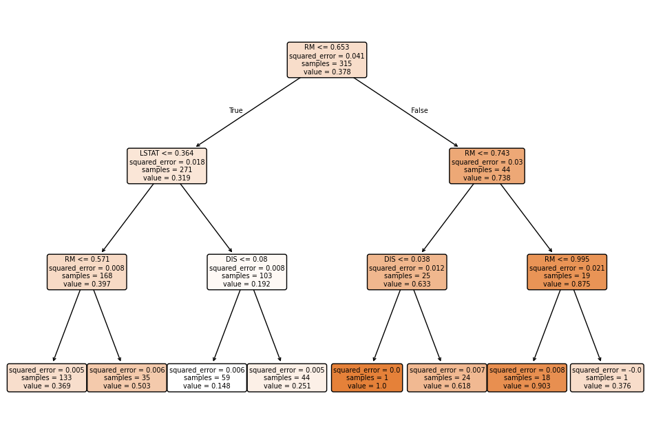 A Decision Tree splits the data into different groups based on certain conditions (or features) that maximize prediction accuracy. The division of the data follows the feature that enables the best separation of the data (here: RM). This is done by selecting the feature and threshold that provide the greatest purity or information gain.