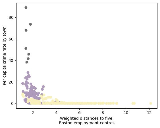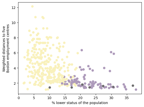 The second scatterplot depicts the relationship between low-status population proportion and distance to five Boston employment centers. Cluster 3 has consistently short distances but a wide range (10–37%) of low-status residents. Cluster 2, with the lowest crime rate and up to 20% low-status population, is spread both near and far from employment centers. Cluster 1 is mostly near employment centers, occasionally at medium distances, and has a relatively high low-status population (15–40%).